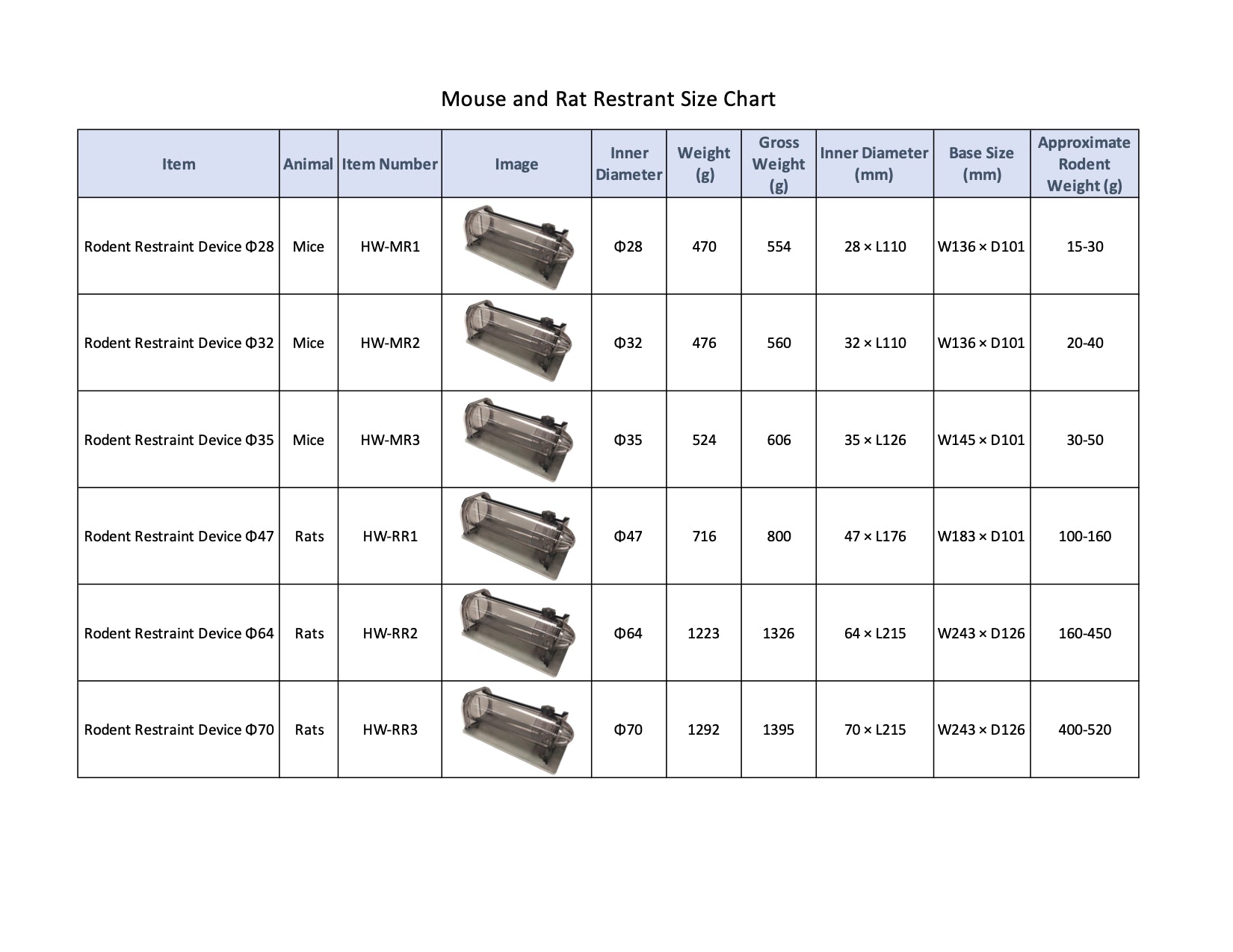 Fully autoclavable rodent restrainers with innovative design offered in six sizes.