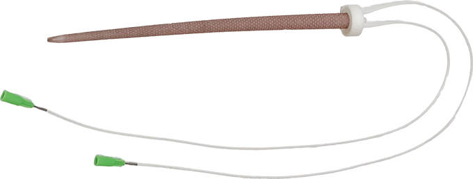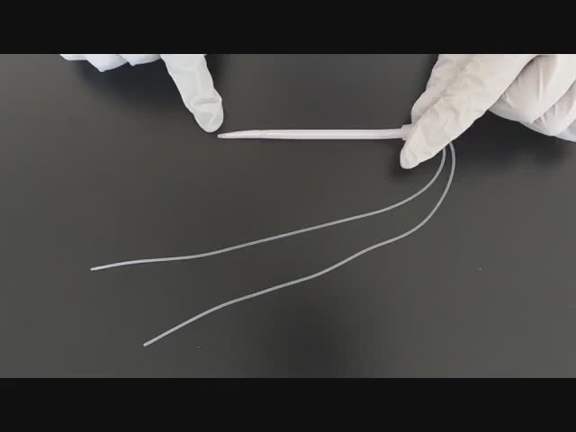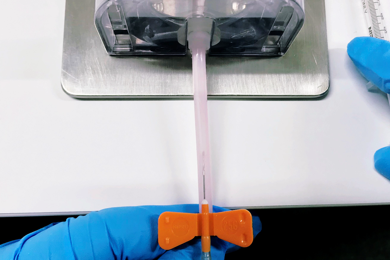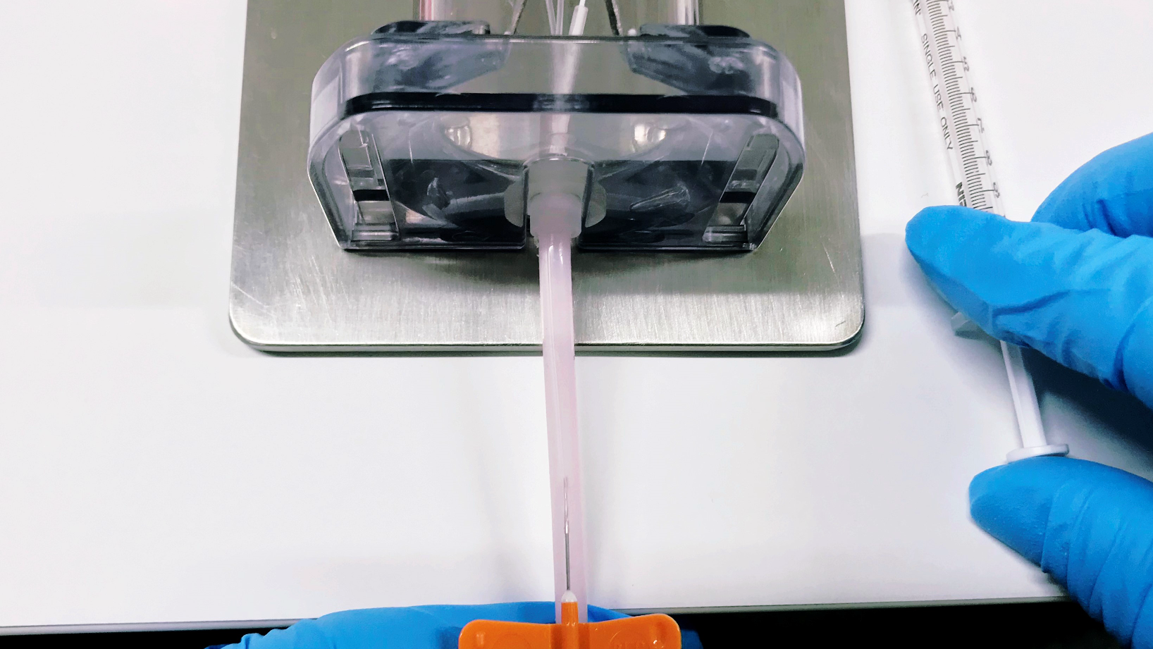 Attach one of the tubes to the syringe filled with simulated blood, and place cotton under the other tube.